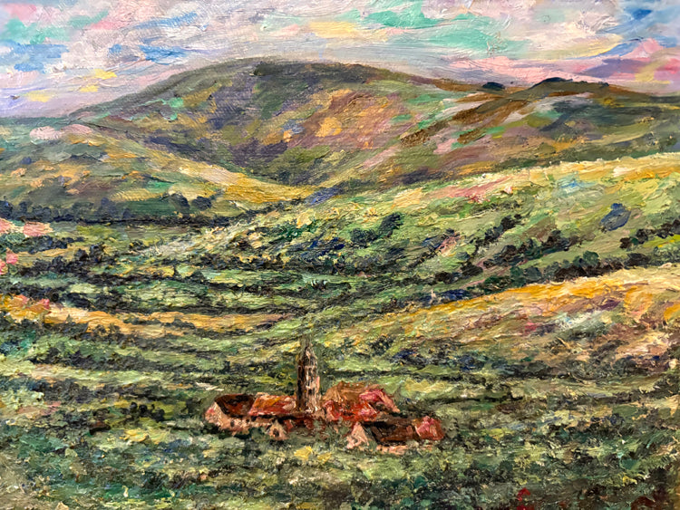 About this Painting: This a magical city in Wales, Ruthin. A cobblestone town built around a castle. It was a journey of the unknown but its comfort and history enveloped my sense of wonder and beauty. All introduced to me by a Brit man.